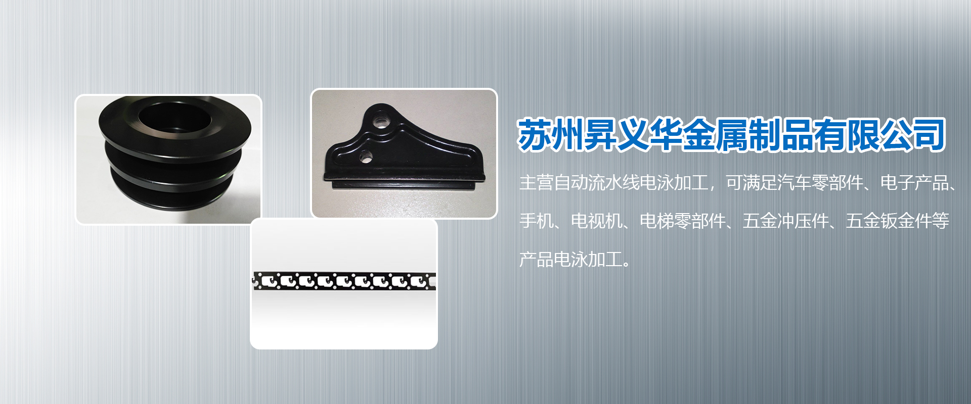 蘇州昇義華金屬制品有限公司是一家進(jìn)行各類(lèi)金屬表面處理專(zhuān)業(yè)公司。主營(yíng)自動(dòng)流水線(xiàn)電泳加工,可滿(mǎn)足汽車(chē)零部件、電子產(chǎn)品、手機(jī)、電視機(jī)、電梯零部件、五金沖壓件、五金鈑金件等產(chǎn)品電泳加工。